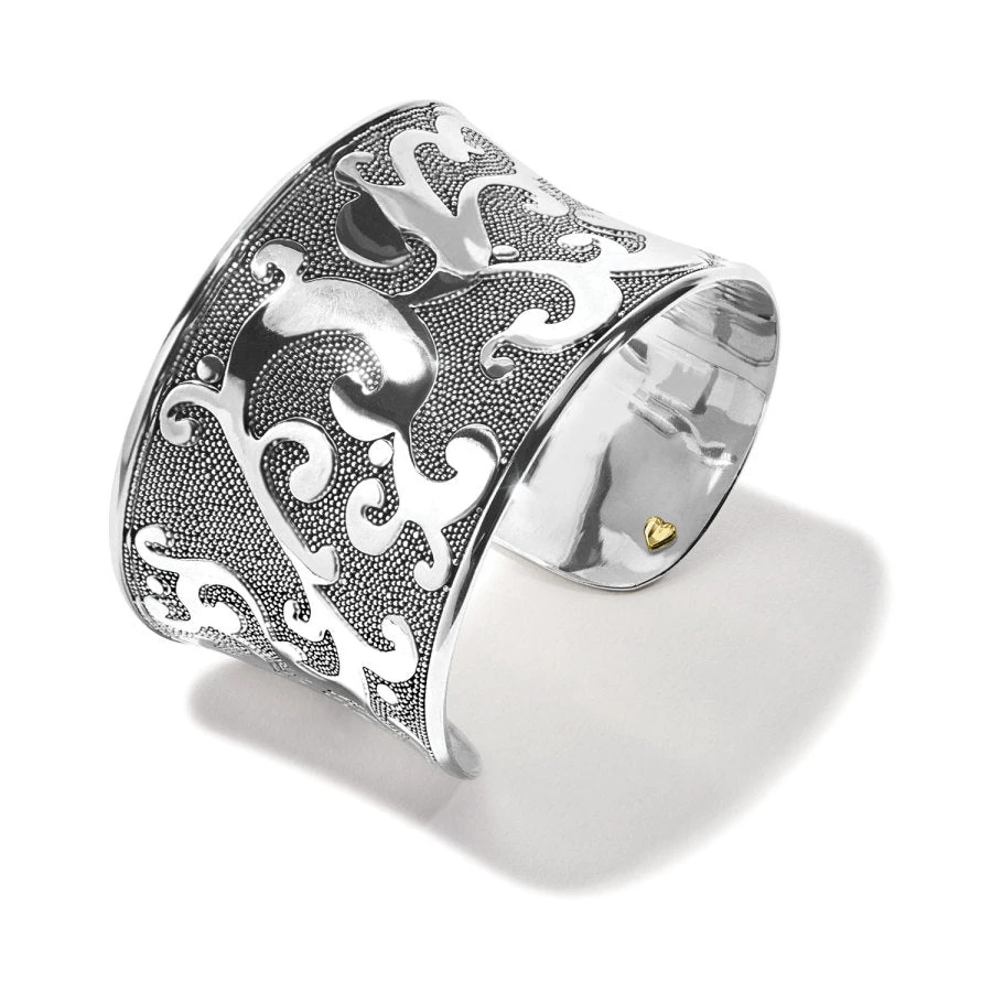 Crafted by hand in Bali, this silver cuff shines with an exotic motif and the ancient art of Balinese granulation.