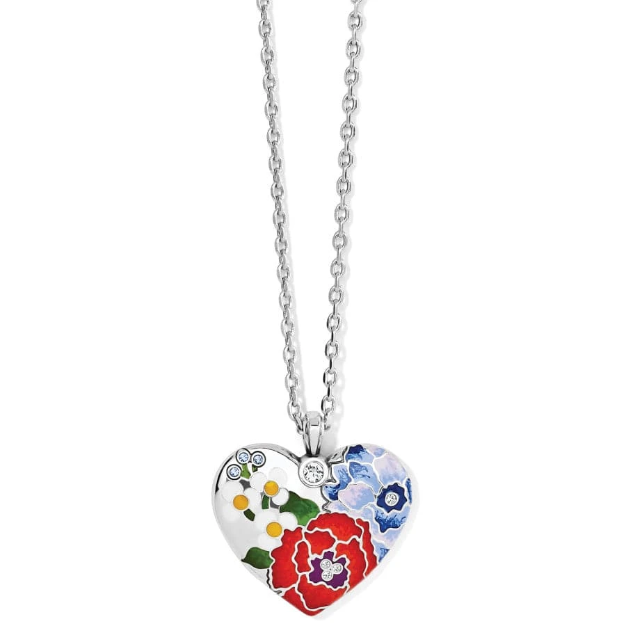 Inspired by wildflowers of the English countryside, a painterly flowerscape blooms against the white background of a stunning hand enameled heart pendant