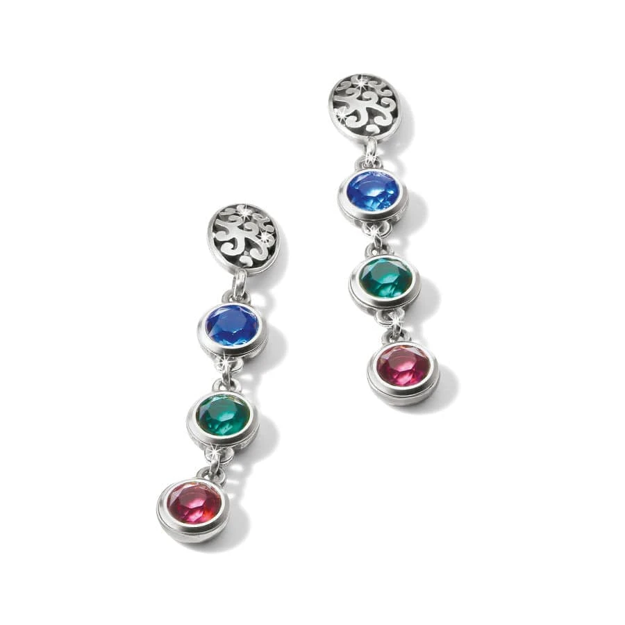 “Pointillism” is the technique of small, distinct dots of color, applied in patterns to form an image. These earrings with translucent crystals in amethyst, aquamarine, emerald and sapphire, along with pierced silver scrolls, are dots that blend together to create a harmony of color and form.