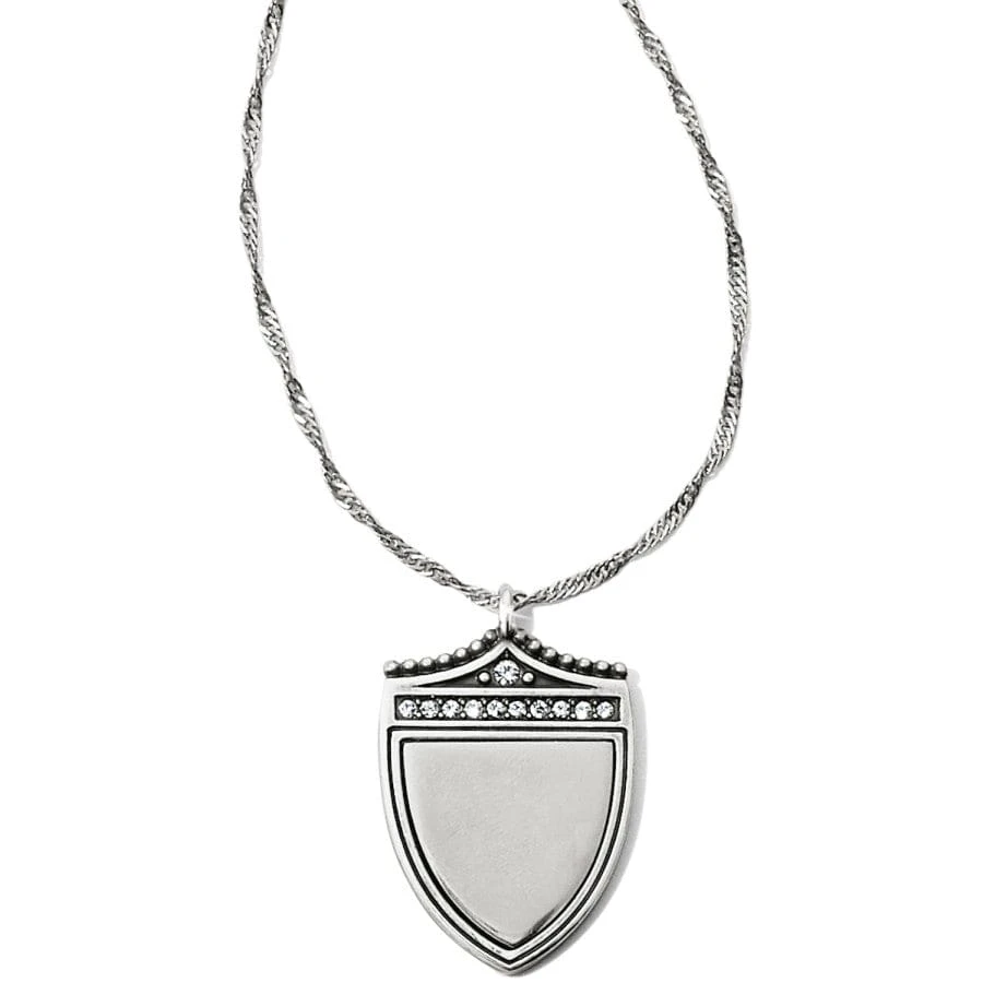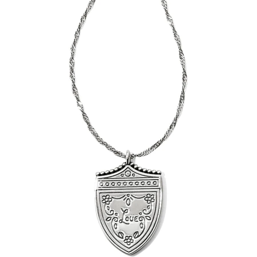 Paying homage to historic medals and crests, this collection’s pendants suggest the romance of another time stylized and made modern. This pendant, a shield, reverses from high polished silver to engraved silver with the word, “Love.