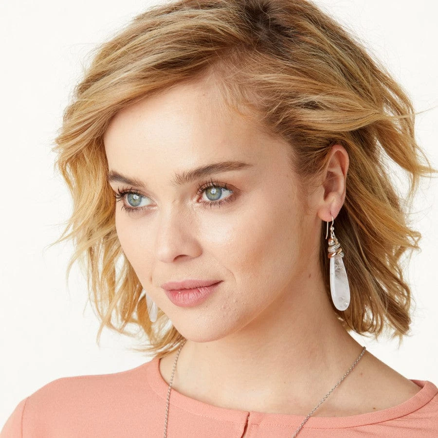Topped by a tumble of mixed metal and fine quality crystal-bejeweled rings, these semi-precious crystal drop earrings symbolize healing and stress relief. Every crystal is carefully selected by hand for a matching set, yet each one, with natural inclusions, is truly one of a kind.