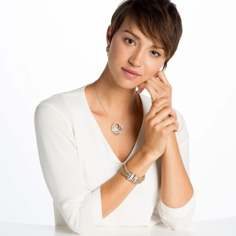 Complementing our Neptune’s Rings Collection, this simple, easy-to-wear pendant is comprised of layered rings of roped silver, pave fine quality crystals, and smooth silver. Like fine jewelry, modern and clean.