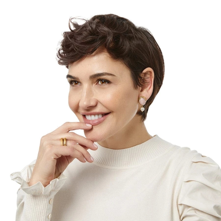 Inspired by the sun, these earrings feature stones that are hand-set glass that is handcrafted in Germany and encased in clear gloss for luminosity. Pearl dangles give them a wear-forever classic touch.
