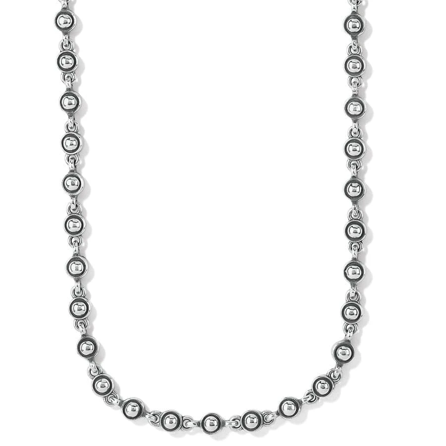 A string of silver beading/studs are linked together to create this super-cool necklace that can be worn short solo as a collar or layered with two other necklaces.
