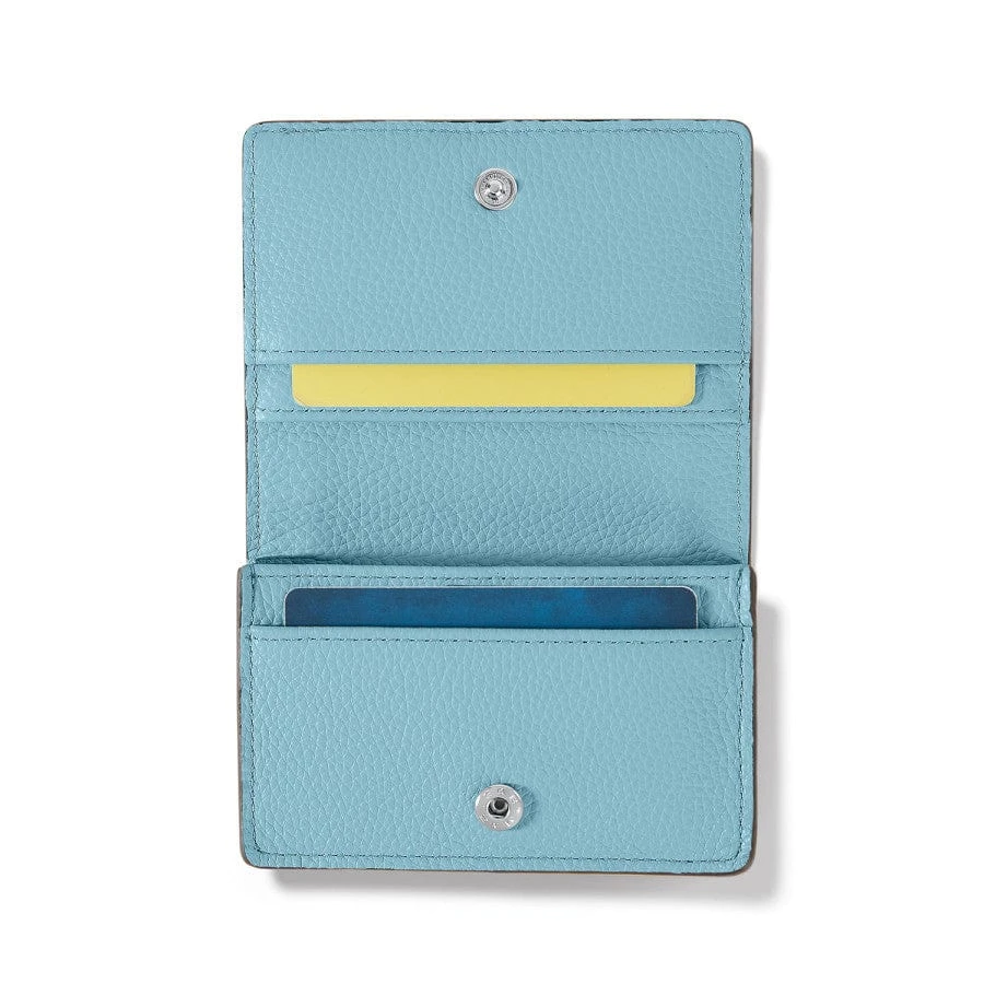 How serene is the soft sea blue of this leather card case? Finished with a sculpted silver shell and elegant stitched details, you’ll want to fetch it from your handbag to simply drink in its calming island vibe!